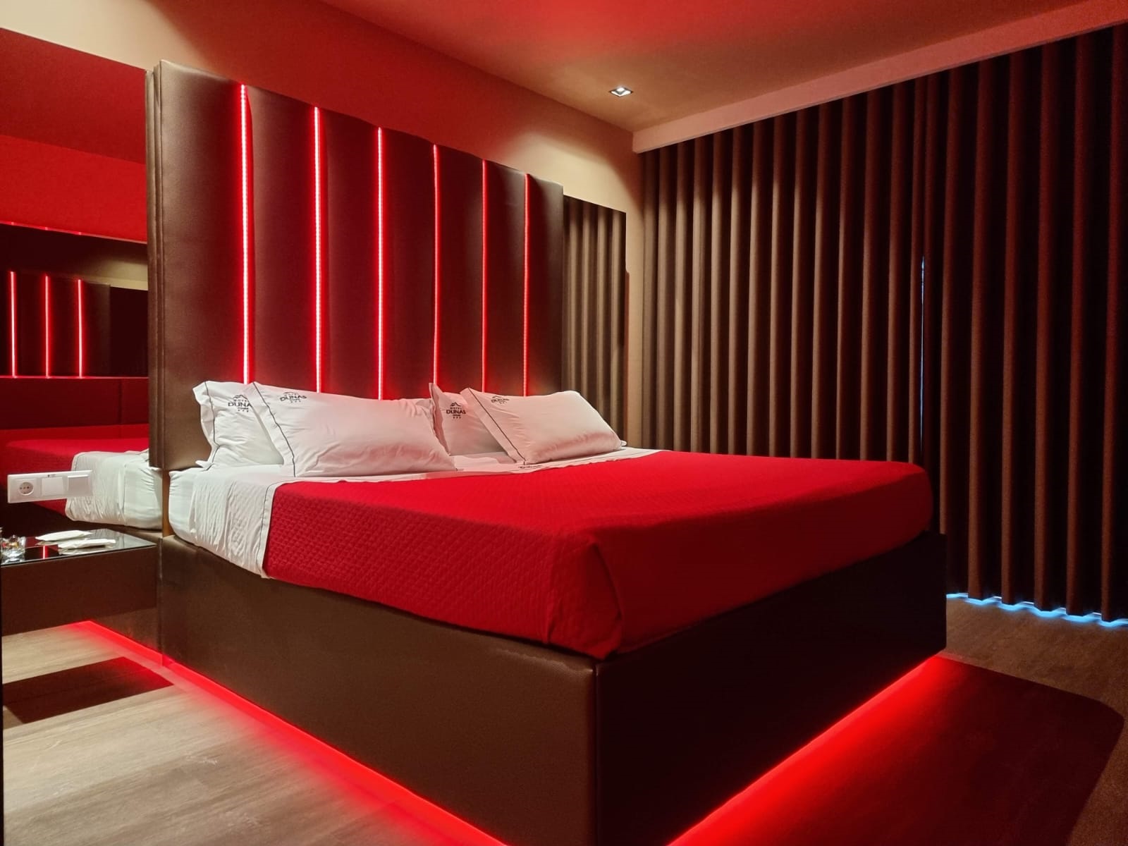 Esta suite conta com cama king size (2x2 m) e uma TV de 43" com canais temáticos, sport tv e canais eróticos (declinamos qualquer responsabilidade, caso haja uma falha nos canais, trata-se de um serviço externo contratado). Fica completa com uma banheira de hidromassagem e uma varanda privativa.