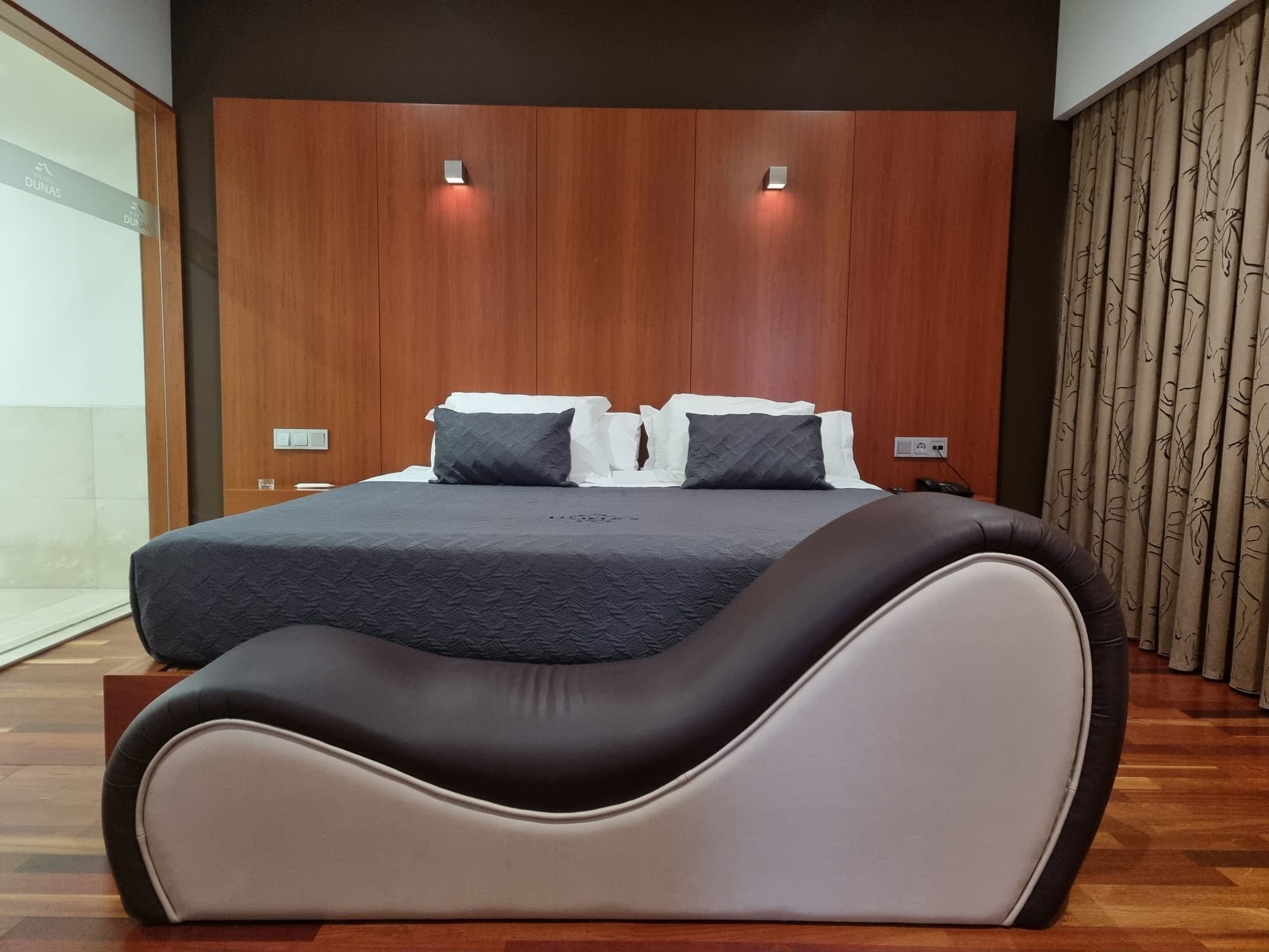Esta suite é maior suite do Motel Dunas em termos de área. Um quarto com cama king size (2x2 m) equipado com uma TV de 55’’ com canais temáticos e eróticos (declinamos qualquer responsabilidade, caso haja uma falha nos canais, trata-se de um serviço externo contratado), uma outra divisão de igual tamanho com espelho no tecto, com uma segunda TV de 20’’ e sofá erótico. Na casa de banho privativa, encontrará um fantástico duche duplo com jatos laterais de água.